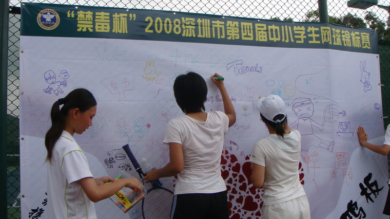 高中组女子单打冠军刘思扬在涂鸦板上写下自己愉快的心情