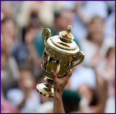 不错,不错,确实是温网的男单奖杯! 诸位如果观察他细的话,可以看到奖杯顶上的那几把小拍子的特殊标志。还有,锃亮的奖杯倒映出温网的绿色草地,还有费天王的迷人身姿。这些你们都看到了吗? |