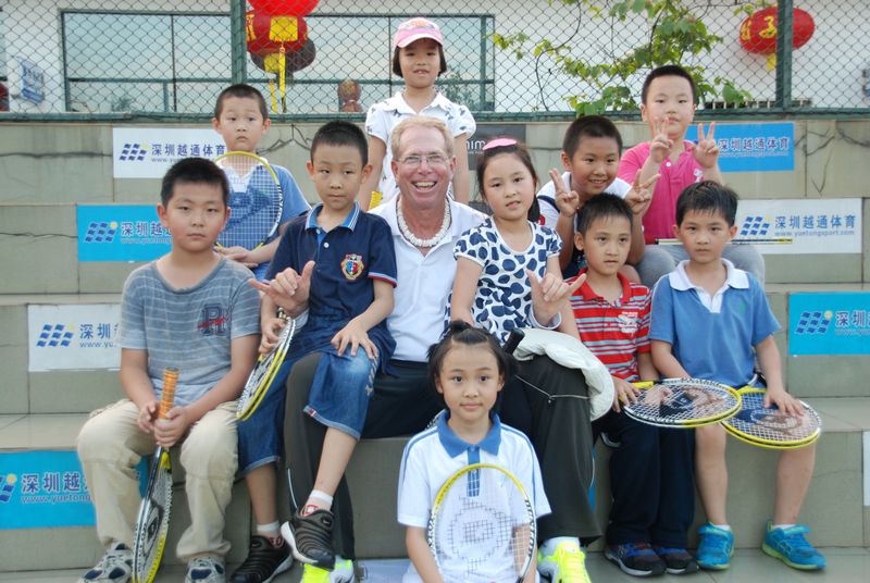 越通学院学习班小朋友和大卫波特教练一起合影留念!他(她)们都笑得很开心!但年纪尚小的他们可能都还不知道旁边的这位爷爷是位多么了不起的人物,(他可以說是職業練中的總教練, 他曾多次為中國國家隊員鄭洁、晏紫、李婷、孫甜甜、朱本強和曾少眩作技術訓練,)这是他们的荣幸!孩子们加油吧,网球的未来就看你们的了。