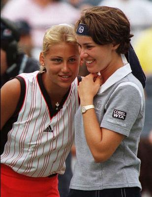 这张照片摄于1998年美网期间的一次活动。那时的辛吉斯是女子网坛的当然霸主,而库尔尼科娃也已小荷才露尖尖角,大辫子的俄罗斯美少女逐渐吸引了世人的目光。