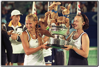 1999年初的澳大利亚网球公开赛,两人合作拿了女双冠军,辛吉斯对大满贯冠军早已视同家常便饭,但这确是库娃美妙的第一次。从此以后,随着两人双打组合的所向披靡,人们开始称其为“美少女&天才少女组合”。  1999年的罗兰加洛斯,女双决赛吸引了全世界的目光,新生代之间的对决,黑珍珠威廉姆斯姐妹最终战胜了美少女天才少女组合,捧起了威氏家族的第一座大满贯女双奖杯。从此以后,女子网坛愈发的热闹,那一年的美网,三位不到20岁的少女:辛吉斯和大小威齐齐闯入四强,以至于当时22岁的达文波特竟然尴尬地发现,自己成了四强中最“老”的女人。