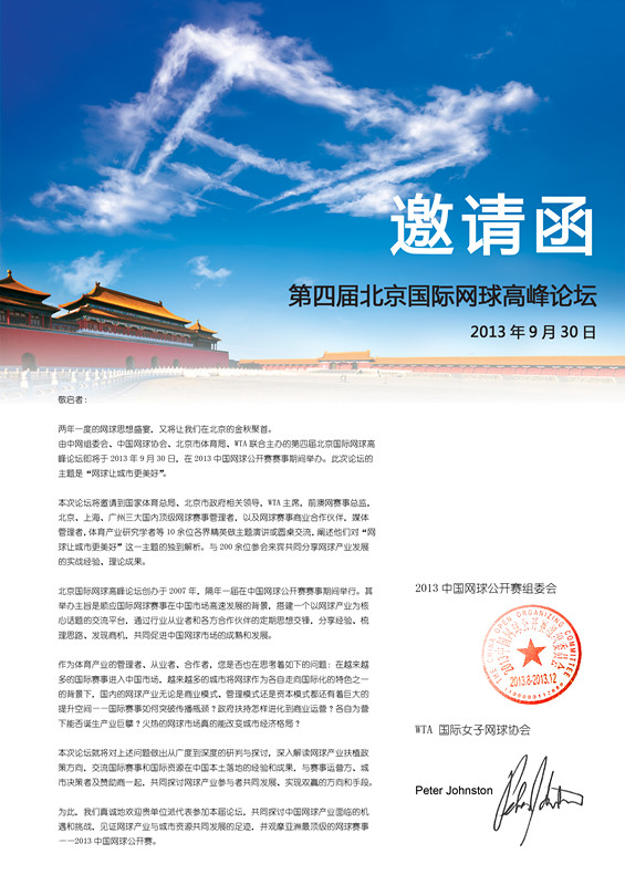 发言嘉宾: WTA主席 前澳网赛事总监 WTA亚太区赛事总监 国内大型赛事代表 知名体育媒体负责人 著名经济学家 体育营销专家 论坛主要议题: 全球不同发展阶段的城市和赛事的共赢经验 大型国际赛事成功的商业运营对区域文化经济发展的带动 作为生活方式的倡导者和城市气质的塑造者,媒体在赛事提升城市影响力的过程中起到的放大效用 赞助商参与赛事对城市内在品位、居民生活方式和消费观念的改变 中国网球产业走向国际化的过程中,资本进入的意义和运作方式 国际赛事和国际资源在中国本土落地的经验和成果