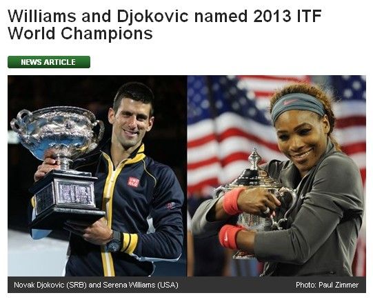 新浪体育讯 北京时间12月19日消息,国际网球联合会(ITF)公布了2013年最佳球员(ITF World Champions)的获奖名单——世界第二德约科维奇击败纳达尔,连续第三年当选男子最佳球员;女子方面则是美国名将小威廉姆斯胜出,这是她第四次获得这一荣誉。而去年也是这两人获奖。