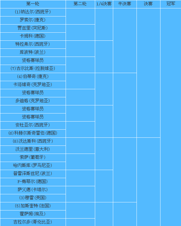 新浪体育讯 北京时间12月29日(多哈当地时间5日)消息,总奖金为1,195,500美元的ATP250巡回赛卡塔尔公开赛公布了正赛签表,作为ATP250级别的赛事,本站比赛的阵容豪华,纳达尔、穆雷领衔出战,费雷尔、伯蒂奇,以及加斯奎特等人也均在签表之中。值得关注的是,纳达尔首轮就将面对昔日温网中的冤家罗索尔,本场比赛也将是两人在2012年温网后的首次交锋。以下是本次比赛详细签表: