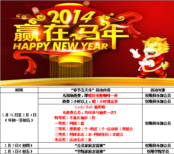 为感谢各位会员朋友在在过去的2013对越通的支持与包容,俱乐部将于春节期间推出会员专享“春节五天乐”特惠回馈活动,其中更有会员家庭友谊赛及学院家庭友谊赛,亲子互动,更添乐趣!