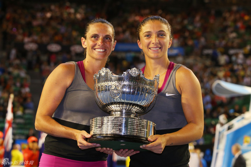 新浪体育讯 北京时间1月24日消息,2014年澳大利亚网球公开赛产生了首项冠军,女双赛场上,头号种子、卫冕冠军埃拉尼/文奇迎战俄罗斯红粉维斯尼娜/马卡洛娃,结果头号种子在决胜盘2-5落后的情况下奋起反击,上演大逆转,最终6-4/3-6/7-5力克对手成功卫冕,守住世界第一的宝座。这也是她们的第四个大满贯女双冠军。