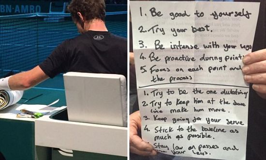 新浪体育讯 北京时间2月19日消息,网球是项孤独的运动,走上球场那就要独自奋斗啦。比赛中球员都会想尽办法把比赛带入自己的节奏、保持一颗平常心,当然每个人所用的方法也大不相同。穆雷[微博]就选择和李娜一样的方式,用小纸条来不断的提醒自己。