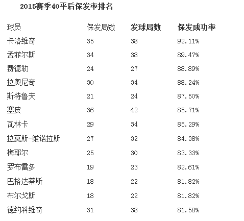 诺瓦克无缘前十 而在40平后的保发成功率中我们却吃惊的看到德约科维奇仅仅排在第13位,塞尔维亚人今年在出现40平的38个发球局中保下了31个(81.6%)。