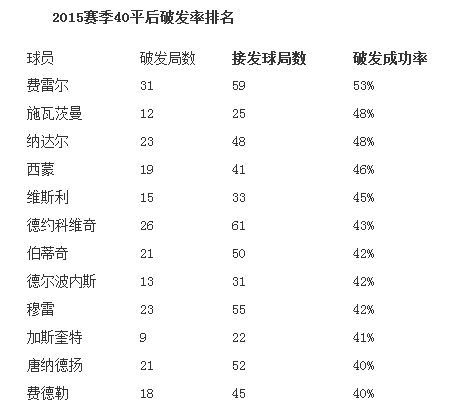 只有一位球员在这一数据中超过了50%,那就是西班牙人费雷尔。今年豪取三个冠军的费雷尔在40平后的破发率高达53%(31/59)。纳达尔(48%)和施瓦茨曼(48%)紧随其后。
