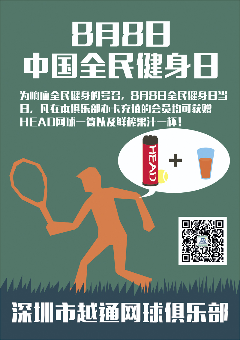 8月8日全民健身日,当日凡来本俱乐部办卡或充值均可获赠海德网球一筒及鲜榨果汁一杯!