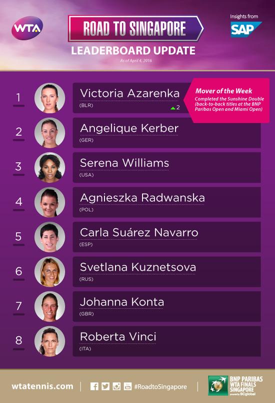 就在一年前,受伤病影响状态不稳的阿扎伦卡世界排名一度跌至第50位。现在,在收获了迈阿密公开赛女单冠军后,白俄罗斯人的世界排名是在2014年以来首次重回前五,并且在“迈向新加坡(RTS)”积分榜上升至榜首位置。