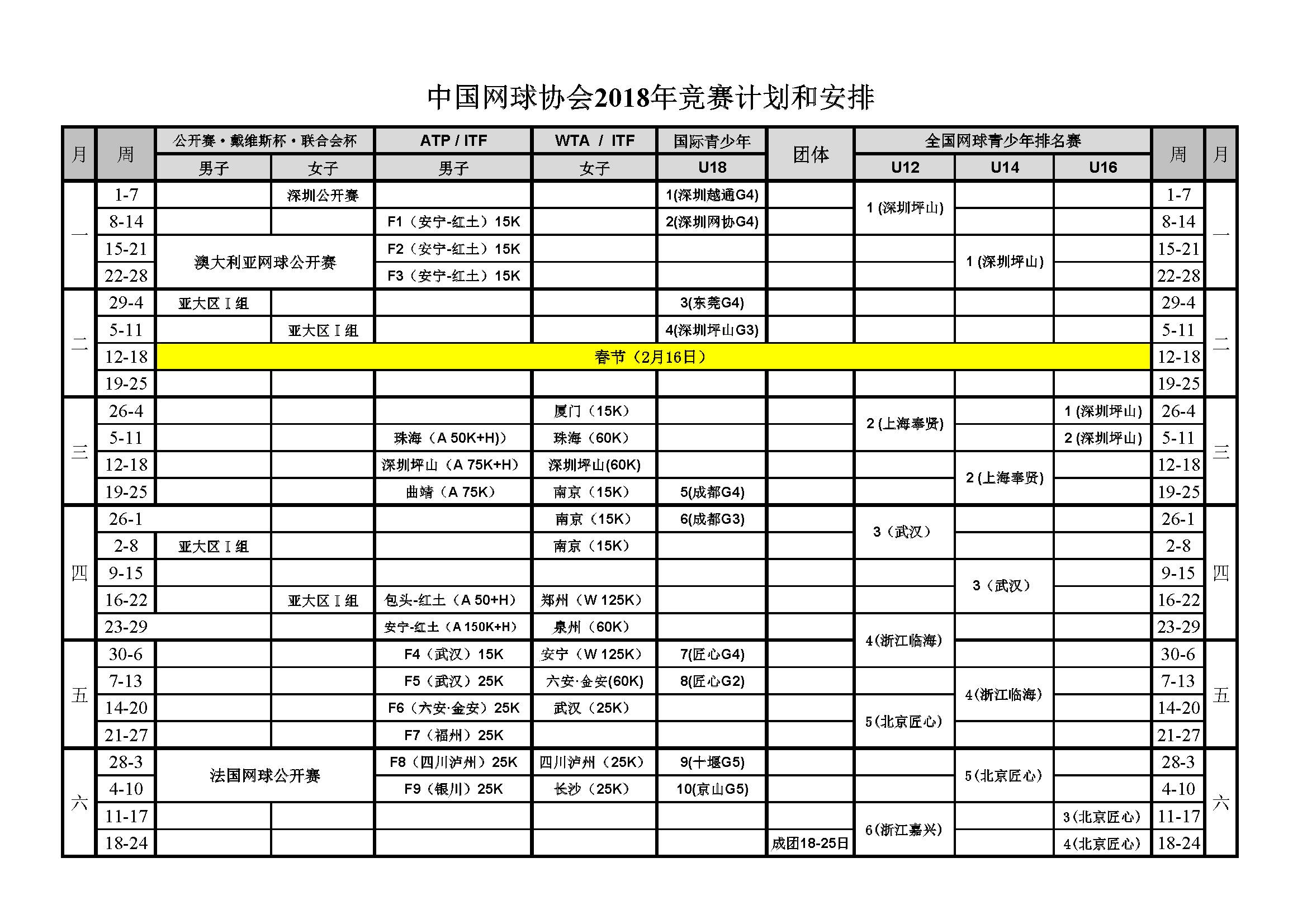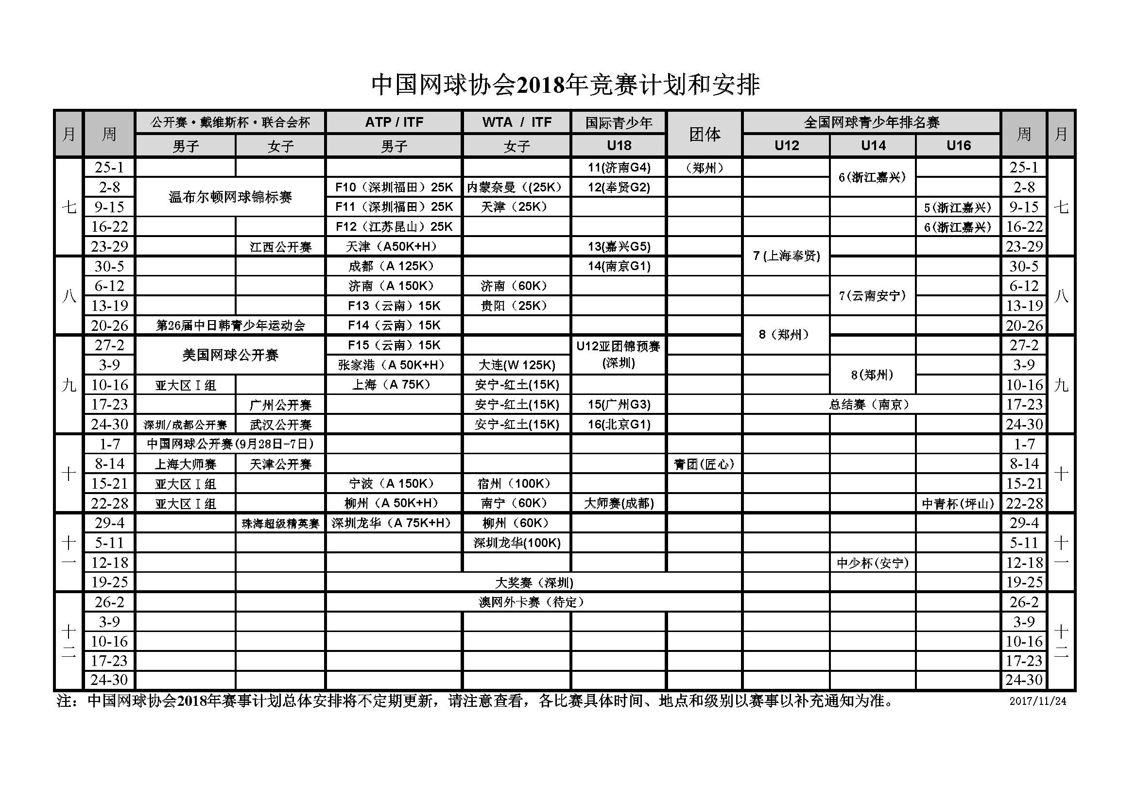 中国网球协会2018年竞赛计划和安排