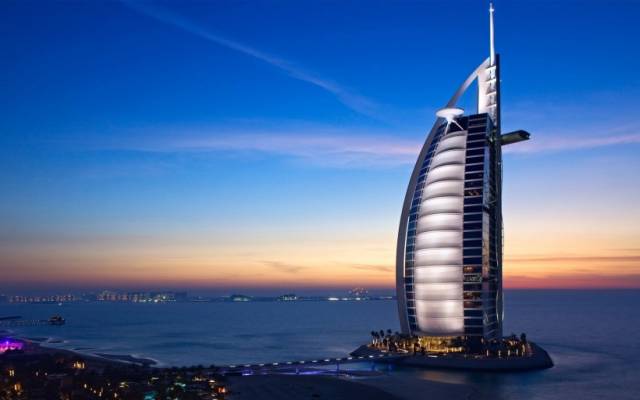 帆船酒店全景,球场位于屋顶外伸圆形建筑