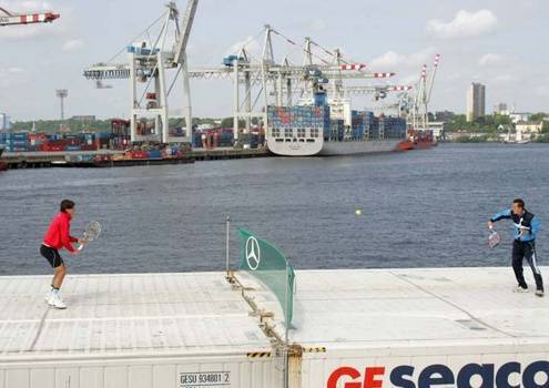 集装箱网球场 在海岸一个大型集装箱上,搭建起一片简易网球场,耳边是油轮的汽笛声,背后是忙碌的工人,这就是德国球员科赫尔斯雷博和西班牙球员罗布雷多进行迷你网球比赛的地方。这样的表演赛在让港口的工人们大饱眼福的同时,也一定会让球员记忆深刻。