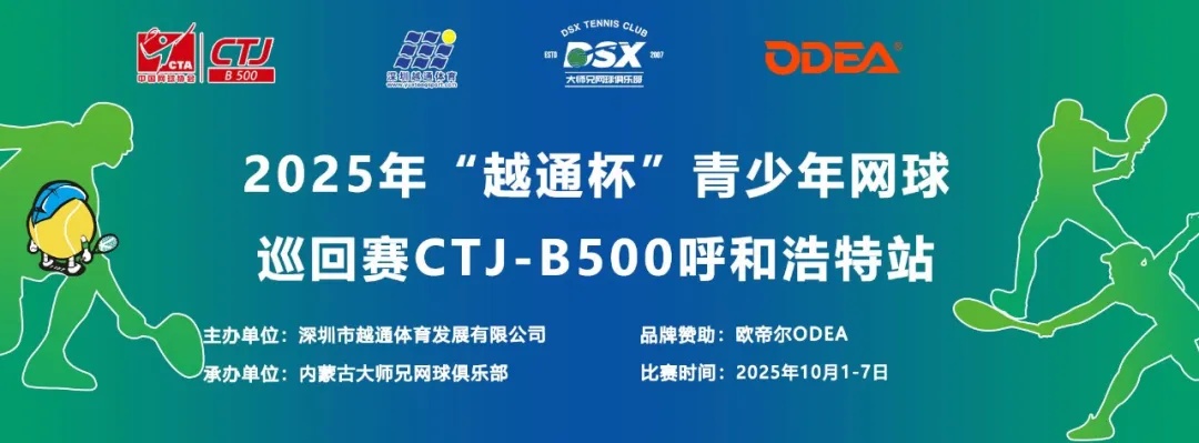 2025年10月1-5日,2025年“越通杯”青少年网球巡回赛第八站呼和浩特站CTJ-B500在大师兄网球俱乐部体职院网球馆落下帷幕。本次赛事由深圳市越通体育发展有限公司主办,内蒙古大师兄网球俱乐部承办,欧帝尔赞助赛事用球。比赛正值十一国庆假期之际,经过五天的激烈角逐,各组别冠亚季军脱颖而出,选手们的炽热激情与精湛球技,在赛场上留下了辉煌的印记!越通体育谨以这场高水准赛事,祝祖国繁荣昌盛,愿神州国泰民安。 01 组织 机构 主办单位:深圳市越通体育发展有限公司 承办单位: 内蒙古大师兄网球俱乐部 赞助单位:欧帝尔网球